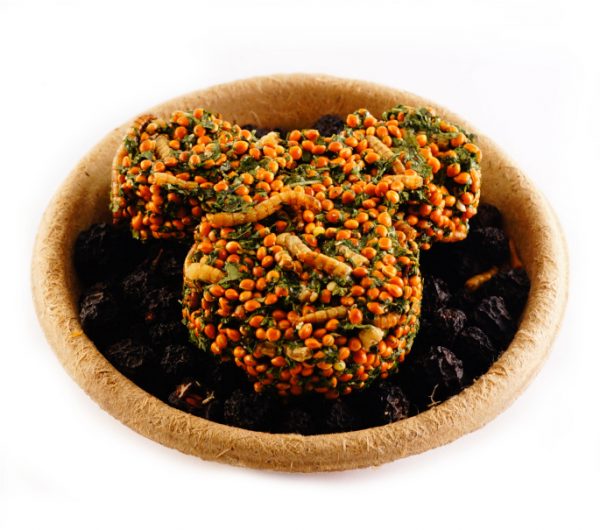Teraz także i nasze futrzane pociechy mogą raczyć swe podniebienia serią proteinowych przysmaków Ham-Stake! Larwy mącznika młynarka połączyliśmy z równie pożywnymi orzechami (arachidowy, kokosowy), nasionami (czarnuszka, len, proso) i owocami (głóg, aronia, jabłko). Całości dopełniają wyrafinowane kompozycje sypkie, takie jak płatki poru z selerem, czy suszony brokuł połączony z odrobiną szyszek chmielu. Tak pysznie skomponowane danie serwujemy na jadalnej miseczce wykonanej z trzciny cukrowej.